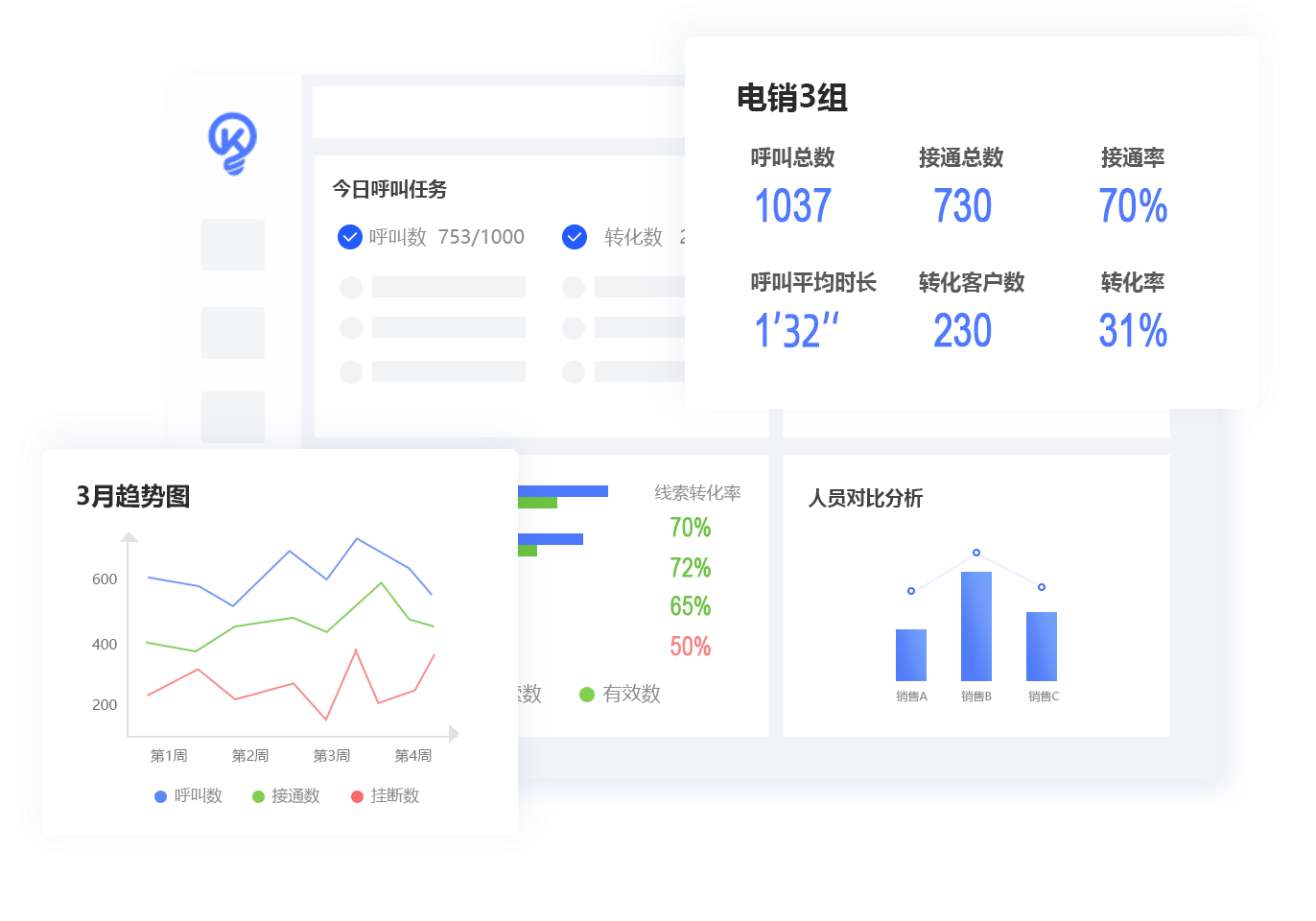 团队与个人呼叫数、接通率等数据实时分析,帮助管理者